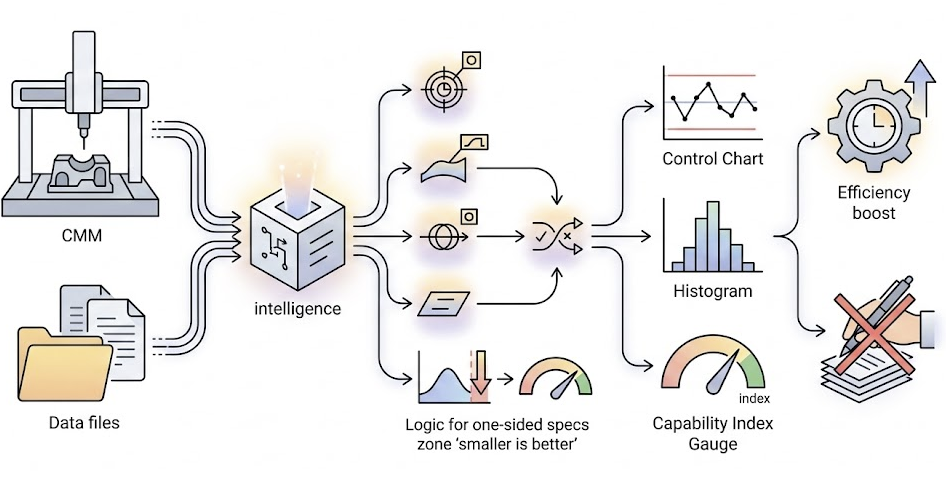 | CMM Integration | Manual typing of CMM reports into Excel; high error rate. | Auto-parse CMM reports; auto-plot complex GD&T. |